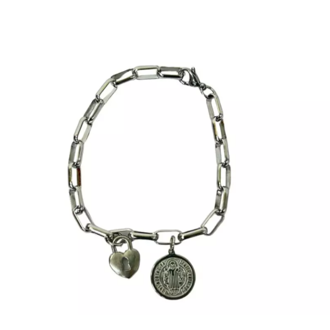 Cadeia em aço inox prateado, elos ovais, com medalha média de São Bento e cadeado em formato de coração, 22cm.