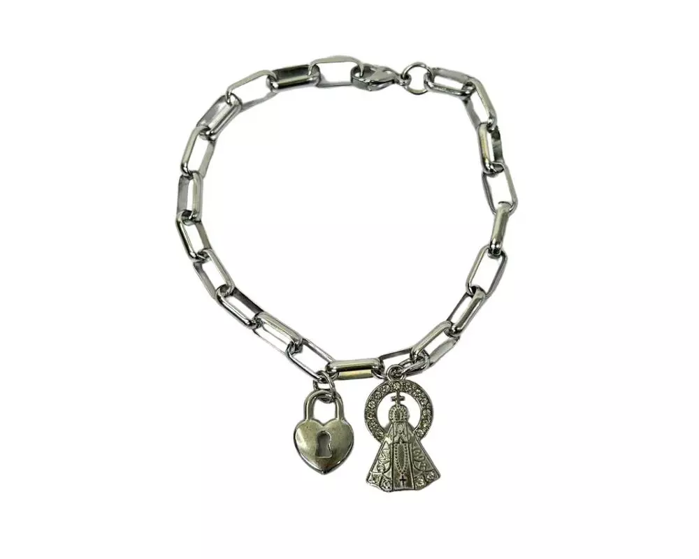 Cadeia em aço inox prateado com elos ovais, medalha de Nossa Senhora Aparecida com resplendor cravejado e pingente de cadeado coração, 22cm.