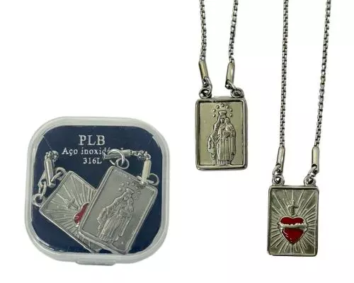 Escapulário em aço inox prateado, formato retangular, com imagens do Sagrado Coração de Jesus e Nossa Senhora do Carmo. Acompanha caixinha quadrada. Item devocional e de presente.